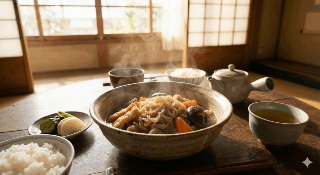 冬にはカモ(鴨肉)が登場します。宍道湖周辺は渡り鳥の飛来地であり、冬にはマガモなどが飛来します。カモ鍋は冬の贅沢な料理として、特別な場面で登場するかもしれません。また、温かいシジミ汁は冬の朝食の定番であり、身体を芯から温めてくれます。出雲地方独特の雑煮も、お正月の場面で描かれることでしょう。