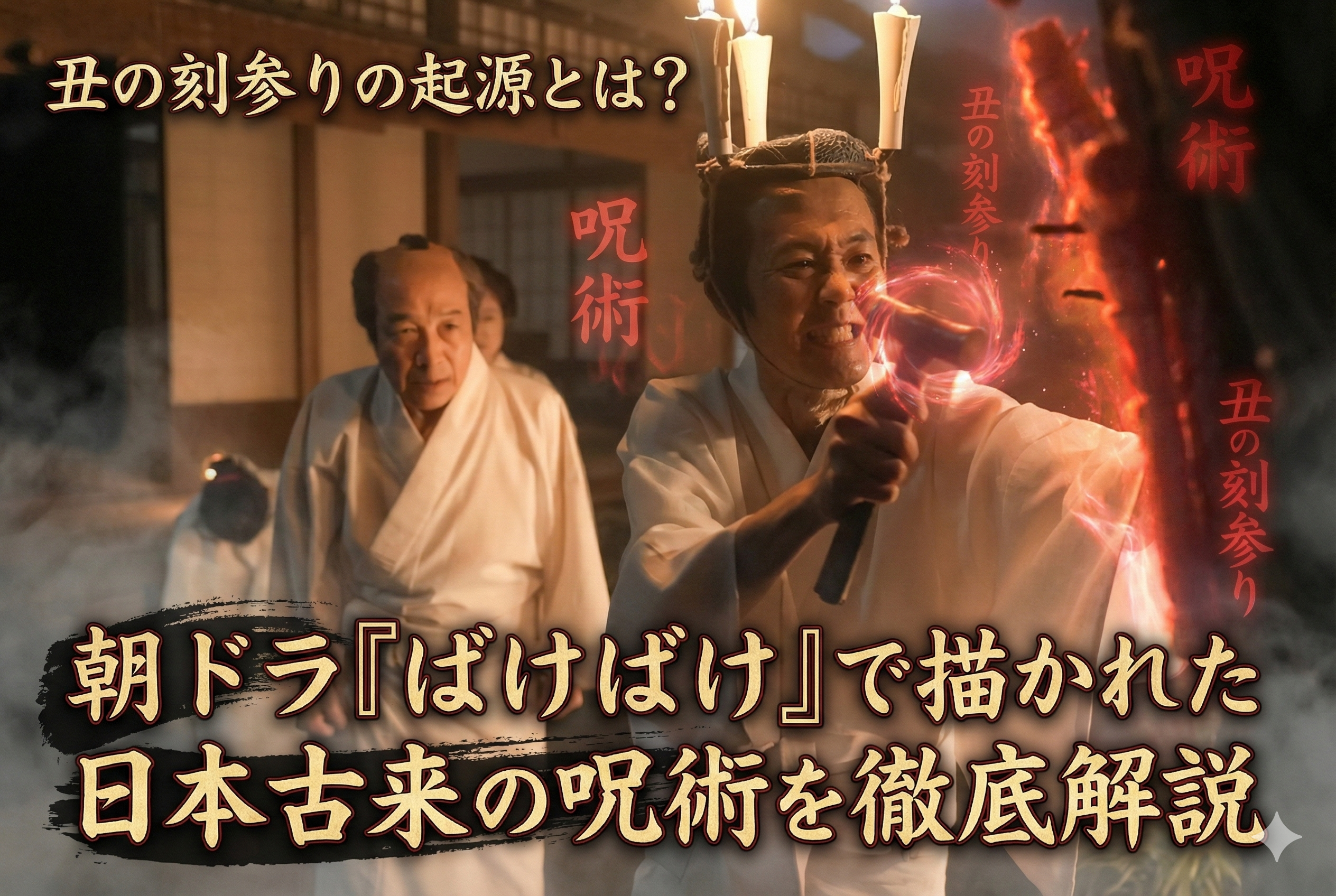 丑の刻参りとは、深夜の丑の刻(午前1時から3時頃)に神社の御神木へ藁人形を五寸釘で打ち付け、特定の相手を呪う日本古来の呪術儀礼です。その起源は鎌倉時代の「宇治の橋姫」伝説にまで遡り、嫉妬に狂った女性が貴船神社で生きながら鬼となった物語が原型とされています。2025年3月31日から放送が開始されたNHK連続テレビ小説『ばけばけ』では、第1話の冒頭からこの丑の刻参りのシーンが描かれ、視聴者に強烈な印象を与えました。